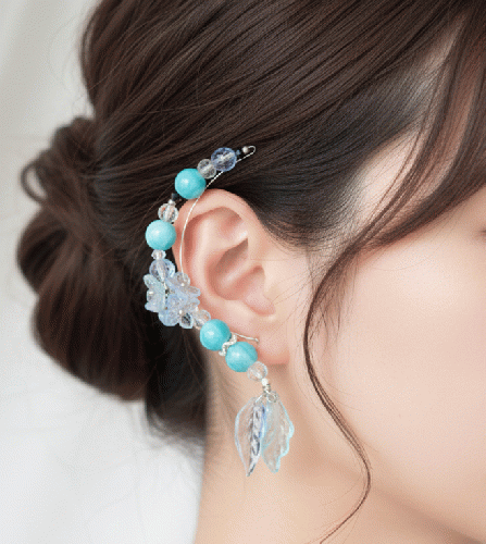 晴れ渡る空と澄んだ水を閉じ込めたような、爽やかな色彩。瑞々しいターコイズブルーのビーズと、光を透過する氷のような花々が、横顔に涼しげで清潔感のある華やぎを与えます。夏の装いや、日常に彩りが欲しい日に。