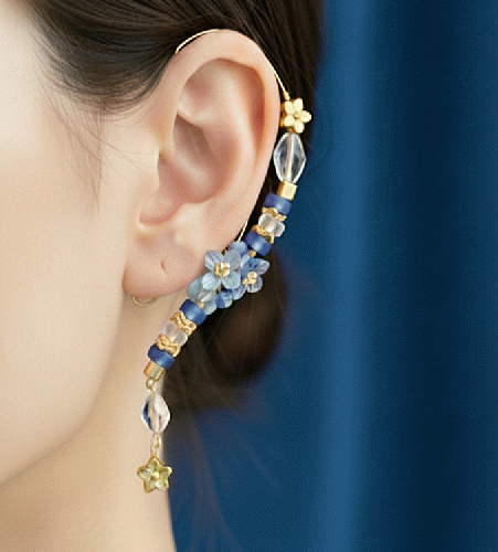 鮮やかなロイヤルブルーのビーズに、ゴールドの繊細なパーツを組み合わせた上品なイヤーカフです。中央にあしらわれた青い花々と、先端で揺れる星のような小花が、動くたびに優雅な物語を演出します。深みのあるブルーとゴールドのコントラストが肌を美しく見せ、凛とした印象に。耳のラインに沿うフック型で、ピアスホールがなくても華やかな耳元が完成します。デニムなどのカジュアルコーデの格上げにもおすすめです。
