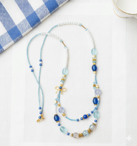 透明感あふれるクリアブルーのビーズに、気品あるホワイトパールとマットな質間のブルーを組み合わせ、奥行きのあるデザインに仕上げました。胸元で揺れるゴールドのリボンチャームが、爽やかさの中に大人の可愛らしさを添えるアクセント。