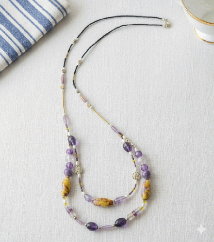 知性を彩る、パープル&マスタードのハーモニー。多種ビーズのロングネックレス 201019-0070