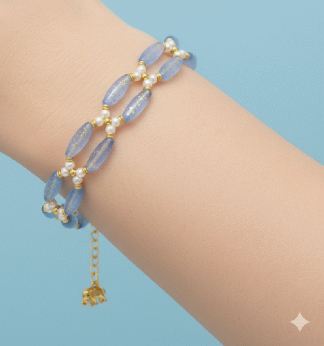 爽やかな空色のガラスビーズに、金メッキを閉じ込めた涼しげなブレスレットです。