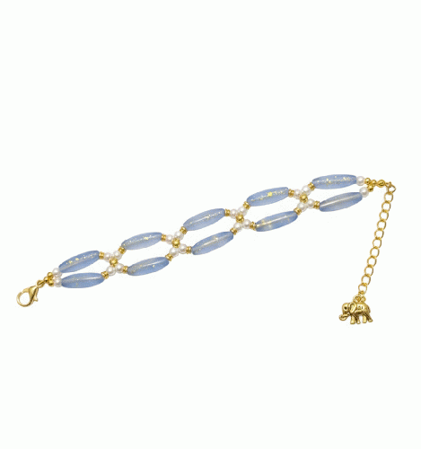 2連風に編み上げた抜け感のあるデザインは、手元を華奢に美しく見せてくれます。瑞々しいブルーと上品なパールの組み合わせは、夏のコーディネートのアクセントにぴったり。アジャスターの先には小さな象のチャームが揺れ、後ろ姿まで可愛らしく仕上げました。