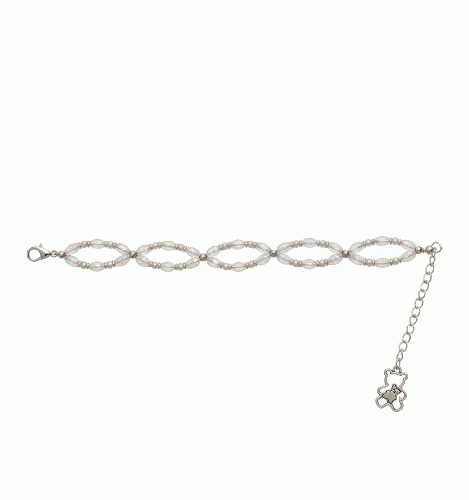 氷の結晶のように透き通るホワイトのビーズを、シルバーカラーのパーツで繋ぎ、清楚で凛とした表情に仕上げました。光の角度によって表情を変える輝きは、冬の澄んだ空気感にぴったり。