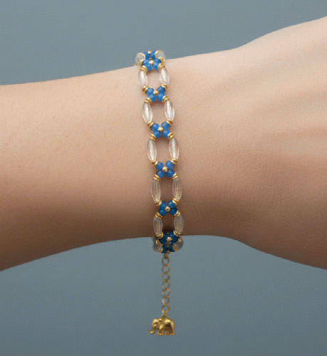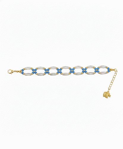 青い空や海を思わせる鮮やかなスカイブルーと、光を通すクリアなガラスビーズを組み合わせた、夏にぴったりのブレスレットです。