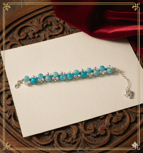 鮮やかなブルーのパールに、上品な光沢を放つホワイトパールを編み込み、雪のようなシルバービーズで繊細にデコレーションしました。清涼感あふれる色使いが、手元をぱっと明るく、涼やかに彩ります。