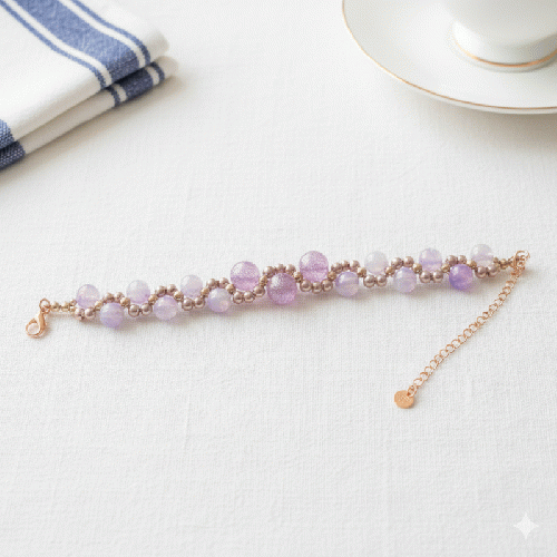 ニュアンスの異なる数種類のラベンダービーズを贅沢に使用し、奥行きのある表情に仕上げた、大人のための編み込みブレスレットです。