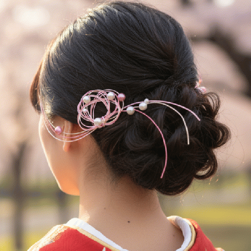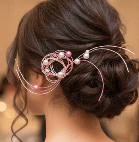 流れるような水引のラインは、アップスタイルやシニヨンなどのヘアアレンジに添えるだけで、横顔や後ろ姿を一層エレガントに、そして印象的に引き立てて