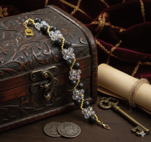 深い闇を思わせるマットブラックのビーズと、光を透過して繊細に輝くクリスタルビーズ。相反する二つの質感が、アンティークな宝箱から見つかった秘宝のような、神秘的な魅力を放つブレスレットです。