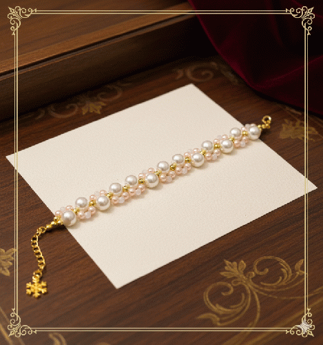 降り積もる純白の雪と、冬の朝焼けに染まる空の色を映したような、可憐なブレスレット。艶やかなホワイトパールと、肌なじみの良い柔らかなベビーピンクを丁寧に編み込み、手元をパッと明るく華やかに彩ります。