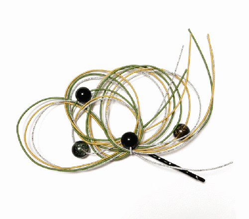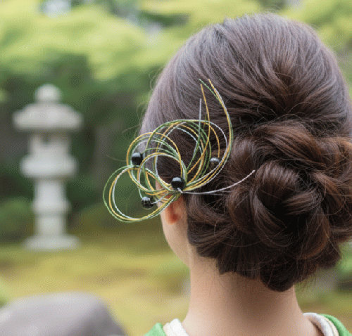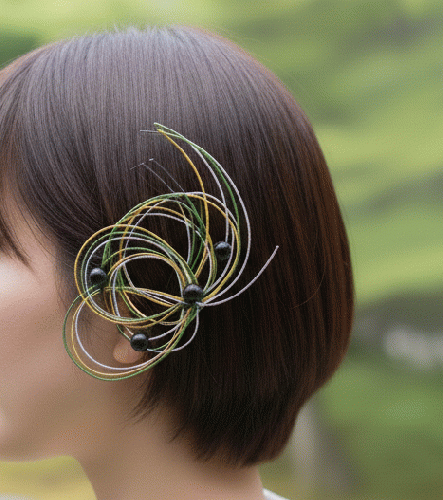 伝統的な水引の技法を用い、現代的なエッセンスを加えたハンドメイドの髪飾りです。 深みのあるグリーン、ゴールド、シルバーの水引を幾重にも重ね、風に舞うようなしなやかな曲線を描きました。