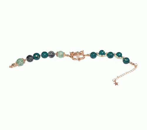中央には、繊細な細工が施された愛らしい猫のチャームを配置しました。深みのあるグリーンや、表情豊かな天然石のビーズを組み合わせることで、落ち着いた大人の女性に似合う「深緑のグラデーション」を表現しています。肌なじみの良いゴールドカラーのパーツを使用し、華やかさの中にヴィンテージ感を演出しました。