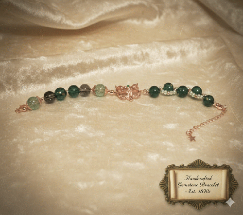 深緑の輝きと猫のチャームが紡ぐ、ヴィンテージ風天然石ハンドメイドブレスレット 20260115-3