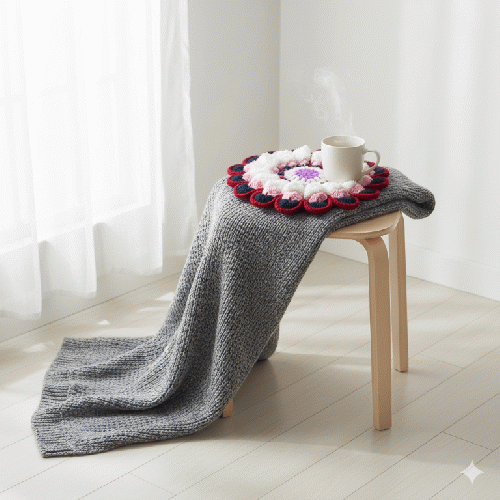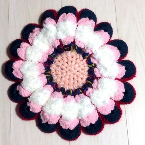 一針一針、丁寧に編み上げた、ぷっくりと立体的なお花が主役のハンドメイド座布団(円座)です。