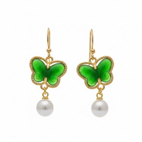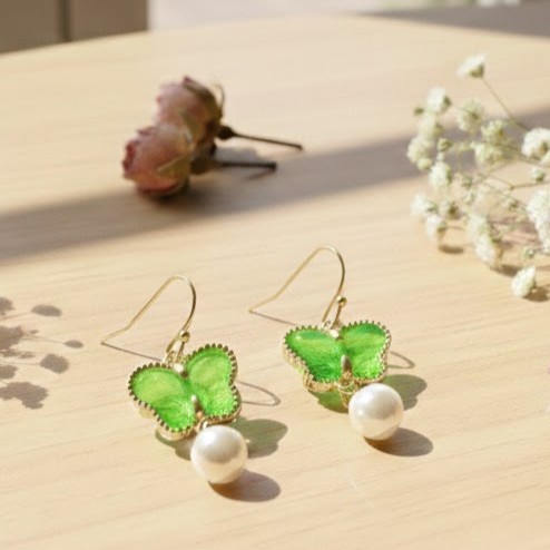 新緑のバタフライと揺れるパールの耳飾り|グリーン・若葉色・蝶・アンティーク風 20260216-12