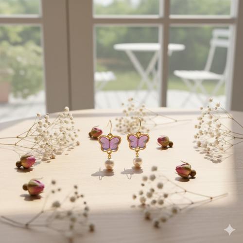 春の光を透過する、透明感あふれるラベンダーパープルの蝶が主役のピアスです。