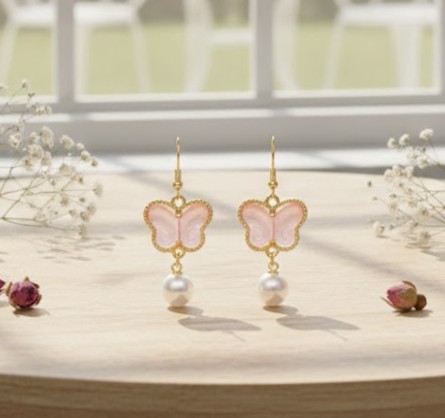 桜色の輝き ベビーピンクの蝶とパールのピアス 20260216-19