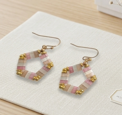 20260330-09サクラピンク 五角形 ビーズピアス ゴールド 揺れる ペンタゴン 上品 大人可