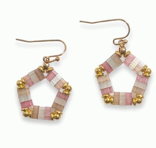 淡いピンクとアイボリー系のスクエアビーズを交互に編み込み、角には華やかなゴールドビーズを添えました。幾何学的な五角形(ペンタゴン)フォルムでありながら、柔らかな配色によって女性らしく、温かみのあるデザインに仕上げています。