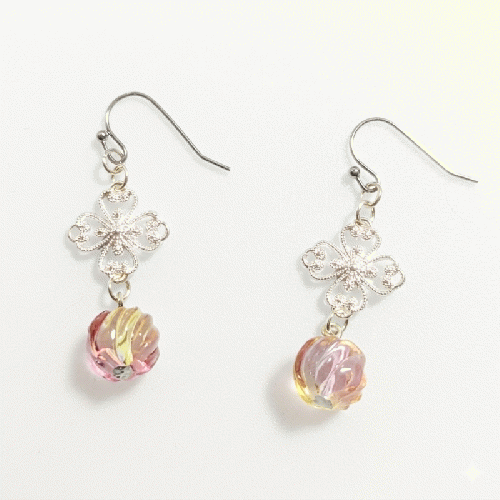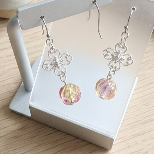 光の角度でピンク、イエロー、ラベンダーが瑞々しく溶け合う、フルーツのようなグラデーションガラスビーズを使用しました。繊細なシルバーの透かしクローバーモチーフを合わせることで、甘すぎない大人の可愛らしさと洗練された印象を演出しています。
