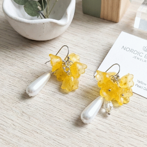 20260330-16イエローフラワーと雫パールの揺れるピアス 北欧風 ミモザカラー 大ぶり 上品