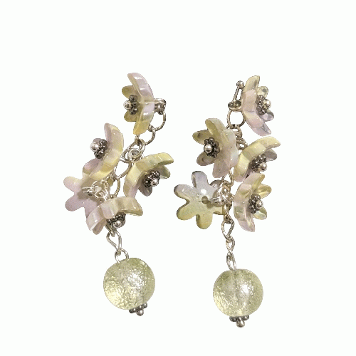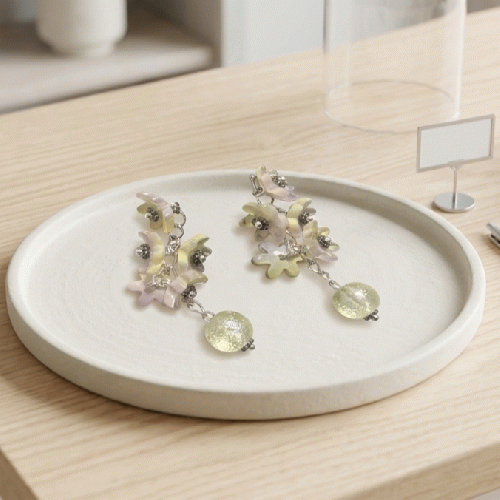 シェルのような上品な光沢を持つパーツを使用し、お顔周りをパッと明るい印象に。淡いパープルとイエローのグラデーションが、春夏の爽やかさや、秋冬の落ち着いた装いのアクセントとしても映えるオールシーズン対応のデザインです。