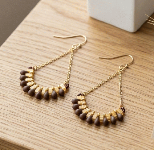 20260417-05秋色 イエロードロップビーズ 扇型チェーンピアス ブラウン 揺れる