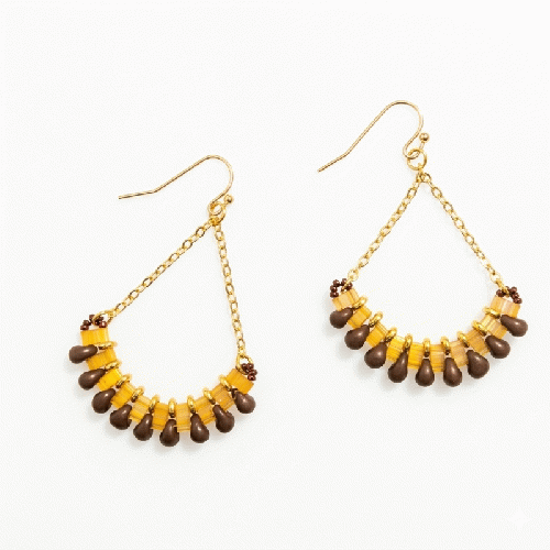温かみのあるイエローと落ち着いたブラウンのビーズを、繊細なゴールドチェーンで繋いだ、洗練された扇型(ティアードロップ風)のピアスです。