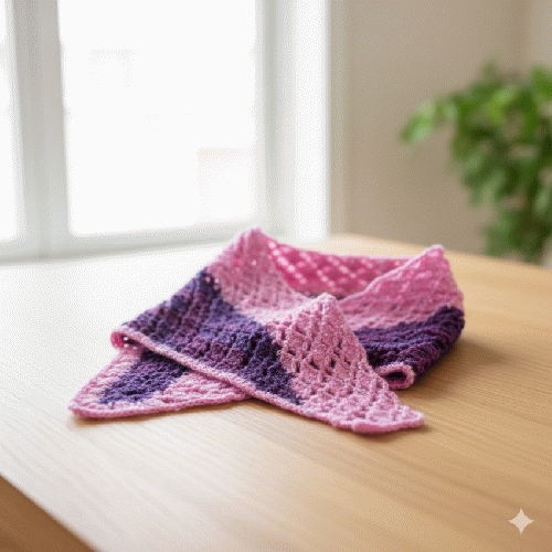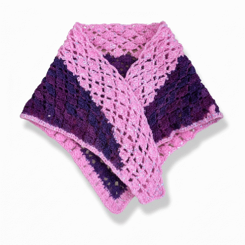 ピンクとパープルの糸を丁寧に編み上げた、手編みの三角ストールです。 光の加減で繊細なラメがキラキラと煌めき、お顔周りをパッと華やかに彩ります。