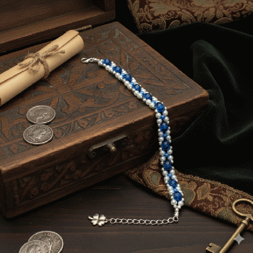 深く鮮やかなロイヤルブルーのガラスビーズと、艶やかなパールを交互に編み込んだ、気品漂うブレスレットです。
