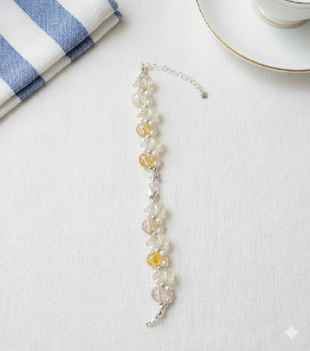 光を複雑に反射するシャンパンカラーのクラックビーズに、清楚なホワイトパールを組み合わせ、シルバーの星型パーツをアクセントに配しました。 柔らかなゴールドとシルバーの調和が、お手元に洗練された華やぎと、凛とした気品を添えてくれます。