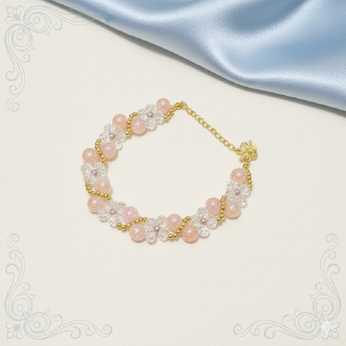 春の訪れを感じさせる、淡いサクラ色のパールと透明感あふれるお花モチーフを贅沢に繋いだブレスレットです。