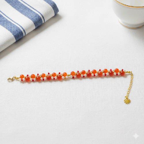 陽だまりの赤。鮮やかレッドビーズとパールの編み込みブレスレット 201019-0009
