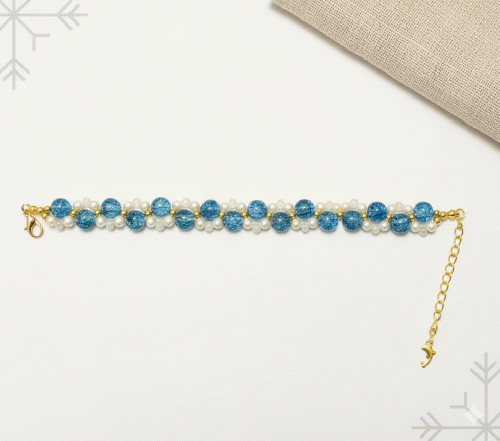 光を受けて複雑に煌めくクラックブルーのビーズと、清楚なホワイトパールを組み合わせた、清涼感あふれるブレスレットです。