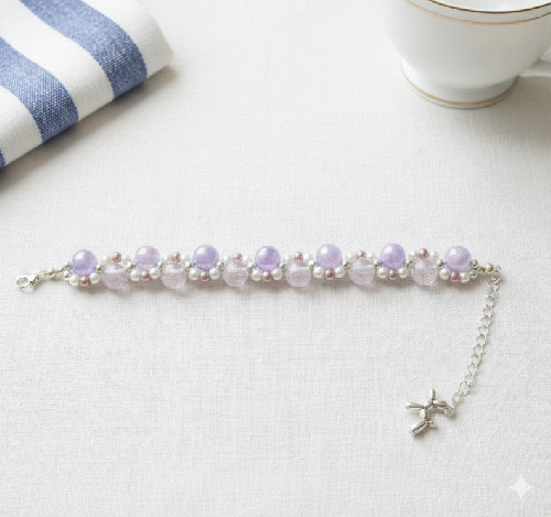 夢見るラベンダー。艶めくパールとバルーン犬チャームの編み込みブレスレット 201019-0019